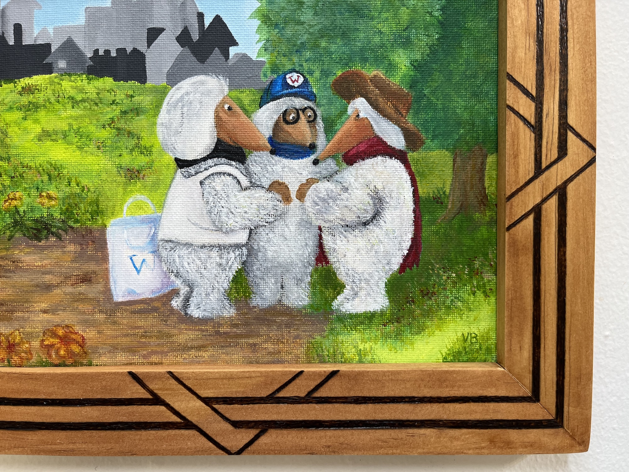 Handmade pine frame with burnt geometric design, wired for hanging