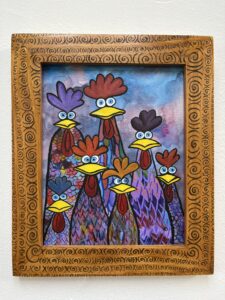Handmade pine frame with burnt abstract flower design, wired for hanging