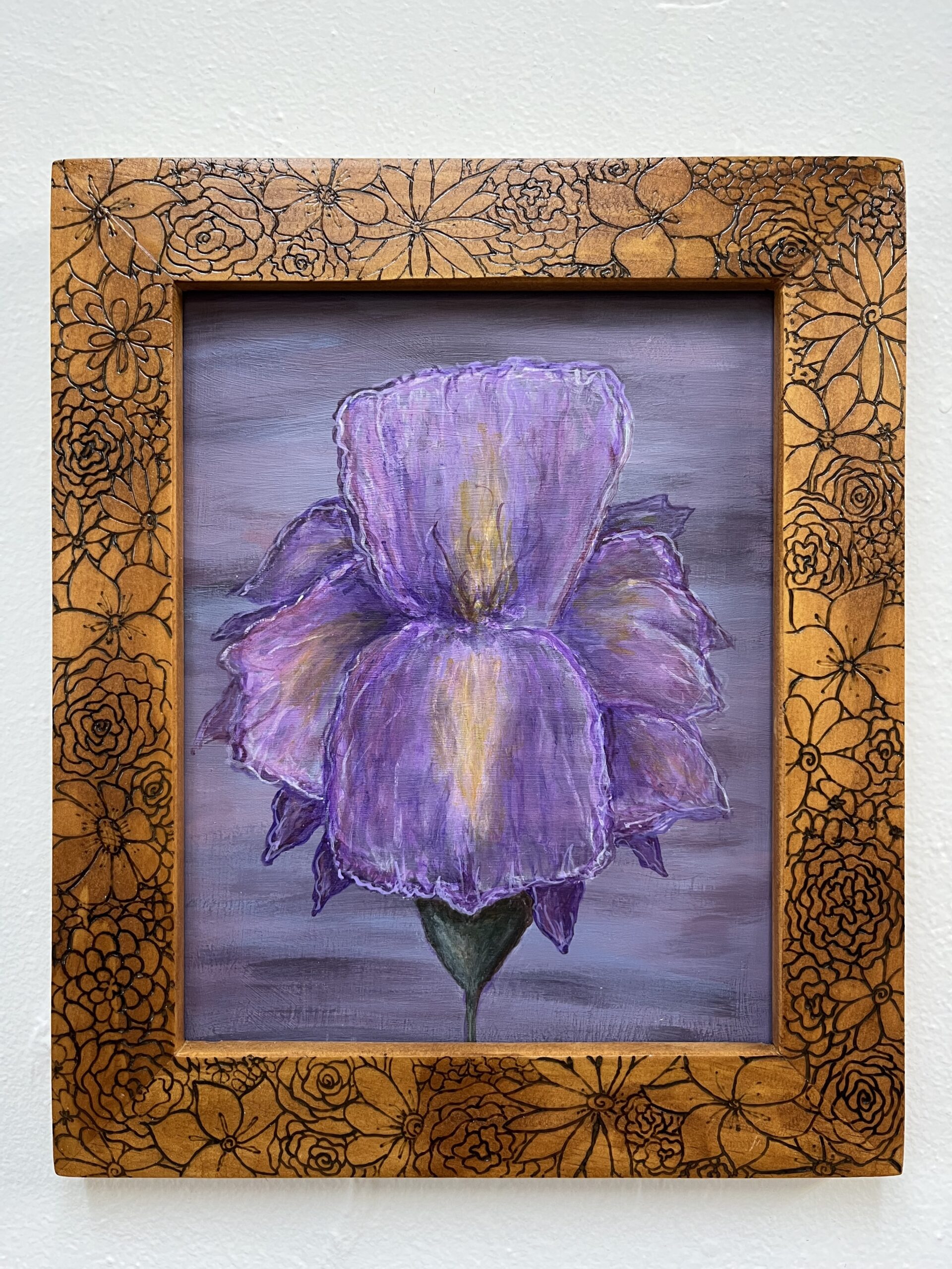 Handmade pine frame with burnt flower design, wired for hanging