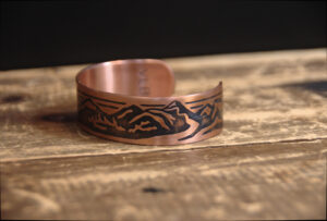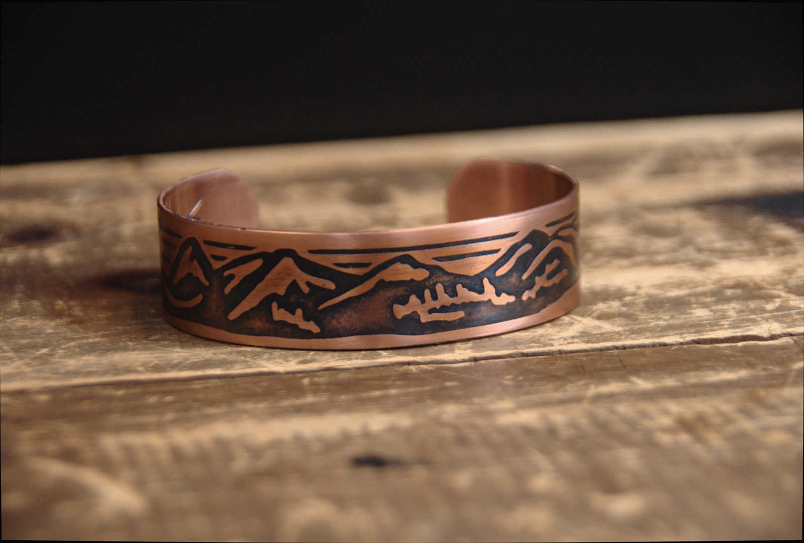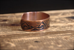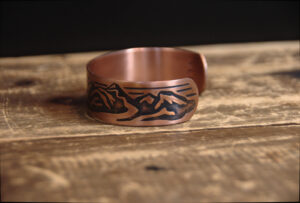 This hand-etched 14-gauge genuine copper bracelet features a hand-drawn sunrise mountain scene reminiscent of the Rocky Mountains, enhanced by sulfur and fire which create a lovely bright copper patina.