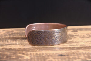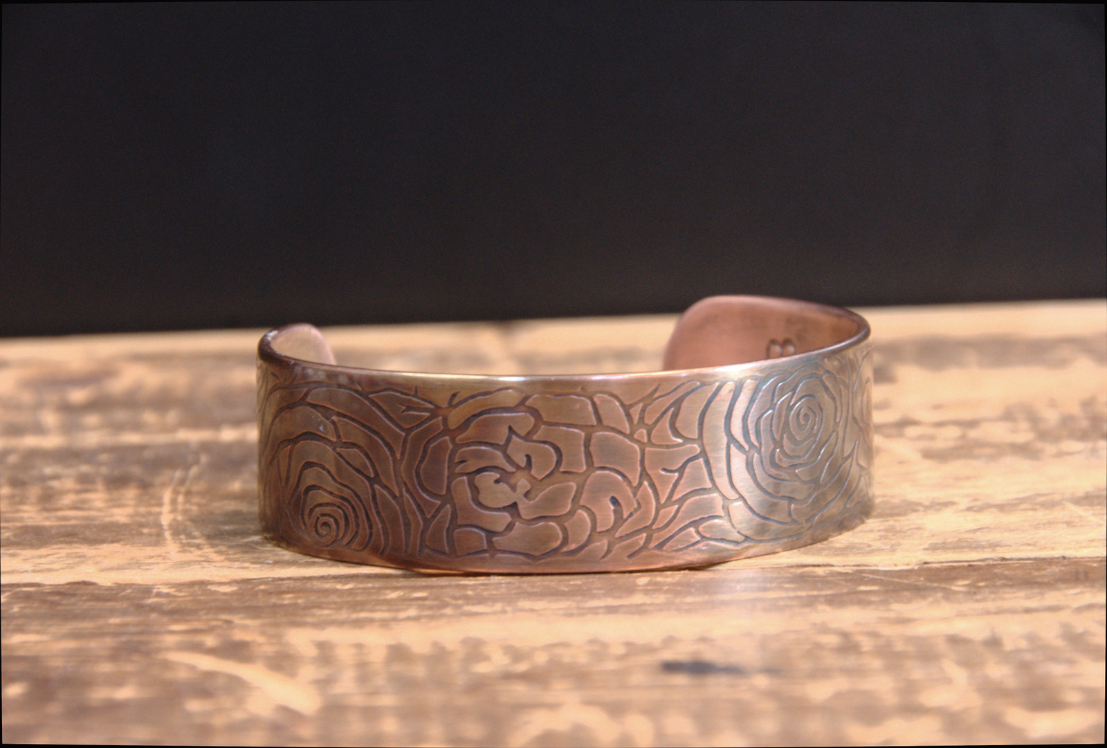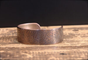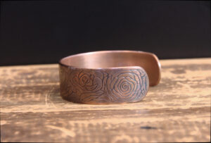 This hand-etched 14-gauge genuine copper bracelet features a hand-drawn floral design enhanced by sulfur and fire which create a lovely vintage-style bronze patina with a high shine.